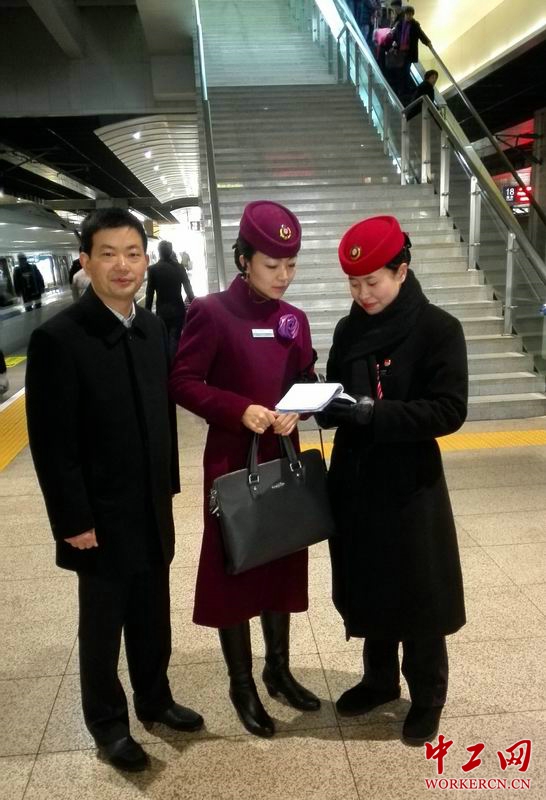 王娇珑说,她和千万个像他们一样的班组一道,奋战在春运第一线,为的就是用他们热情周道的服务来守护亿万国人回家过年的梦想。图为王娇珑和车站交接归还旅客遗失物品。(王一 摄)