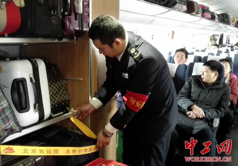 王娇珑从2002年3月参加工作,到如今已经入路13年,她不断地学习客运服务业务,扎实工作。13年来,王娇珑分别担当过京九线、京广线、京沪线等各条线路运输生产任务。她从最普通的列车员做起,无论是严重超员的硬座车厢,还是硬卧、软卧车厢,不怕苦不怕累,从无怨言。她从业务生疏到精益求精,逐步走上了列车长的岗位,现担当北京南至福州G55/56次列车长,班组“一长六员”(一位列车长,六位乘务员),平均年龄26岁,每趟往返两天运送旅客五千多人次。图为王娇珑所在的班组乘务员在认真检查、加固旅客行李,确保行车安全。(王一 摄)