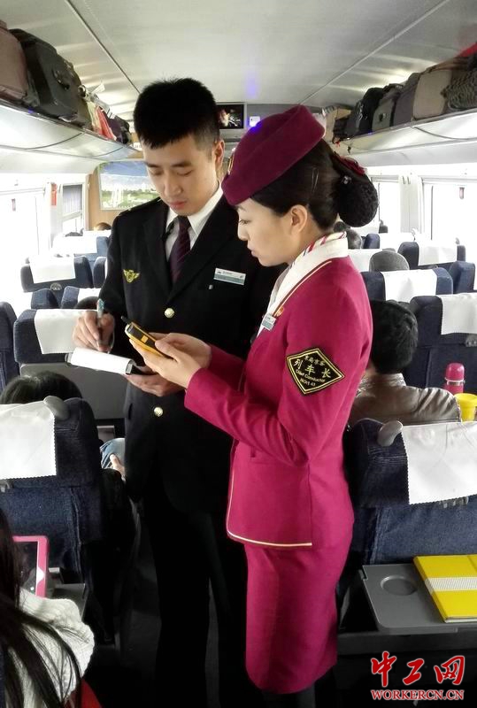 王娇珑说,别看他们的班组只有7个人、平均年龄只有26岁,但他们却要在行车过程中担负起确保旅客安全的重任。落实实名制验票制度、通告站名、组织旅客乘降,安排旅客坐席、维护车秩序,保证列车安全正点、保障饮食供应、保持车内设施良好等等工作都要做。图为王娇珑和班组查验车票。(王一 摄)