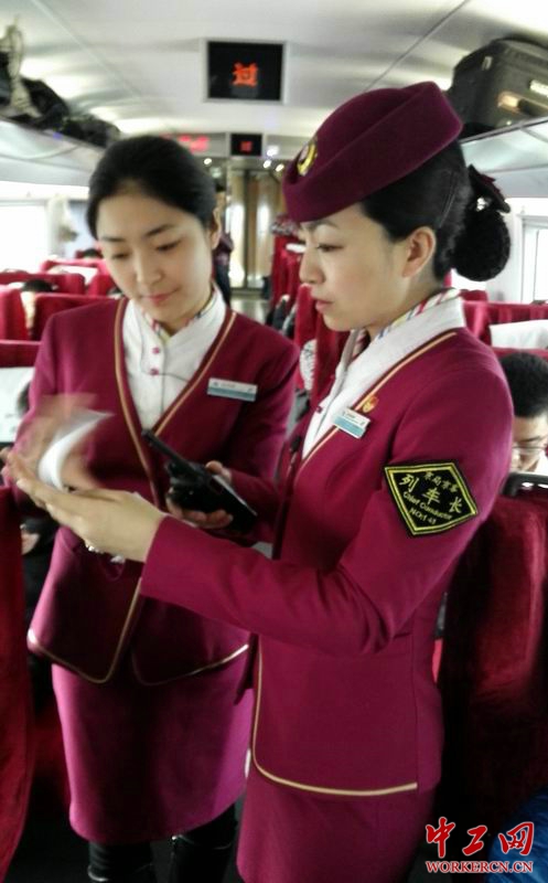舍小家为大家,王娇珑工作十三年以来,只有两次是在家过春节。虽然女儿已经六岁了,但是因为工作需要,她没能陪女儿过过一次春节,这让自己很是愧疚。图为动车运行中,王娇珑和班组乘务员正在检查商务、一等饮品剩余情况,以及车内旅客动态。(王一 摄)