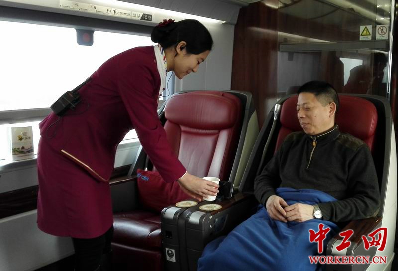 王娇珑说,在车上,无论旅客遇到什么困难,班组都要竭尽所能地提供帮助,要真正践行“安全优质,兴路强国”的新时期铁路精神。图为王娇珑所在的北京客运段G55/56次动车列车班组乘务员正在为旅客提供周到服务。(王一 摄)