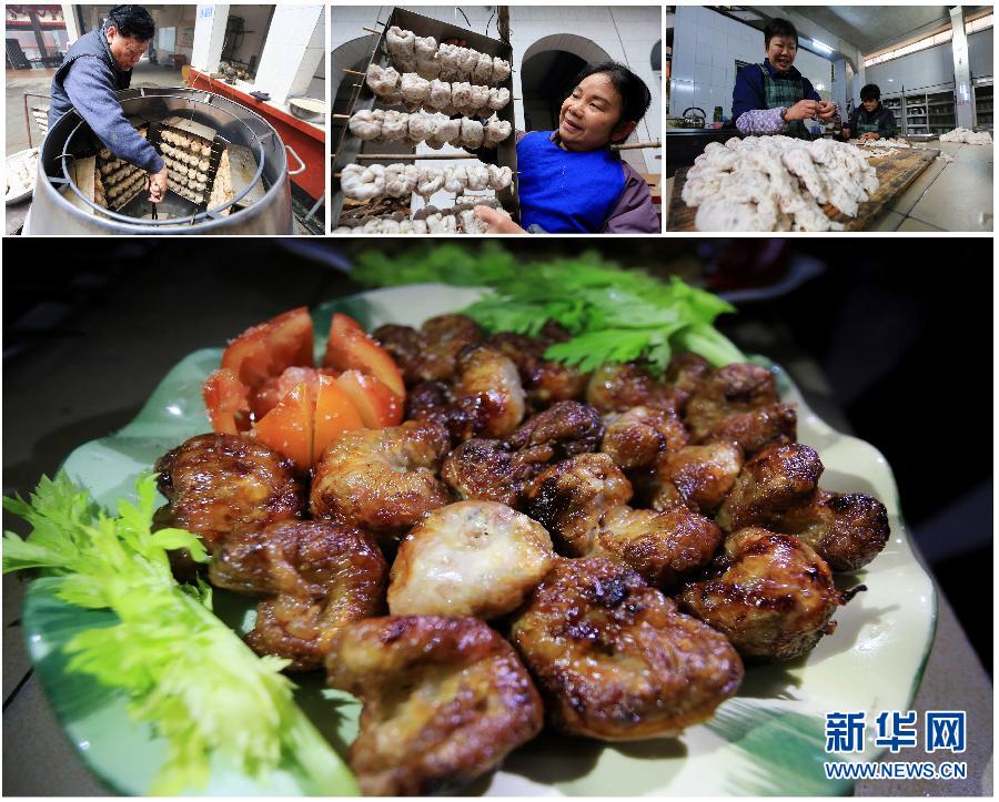 2月13日,山东省沂源县居民在制作沂源特色香肠(拼版照片)。