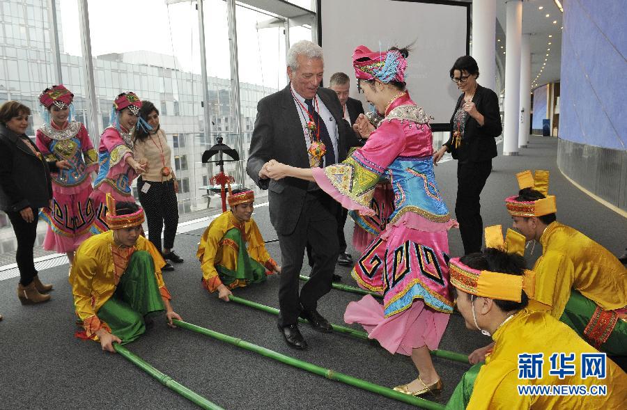 2月17日,在比利时首都布鲁塞尔欧洲议会,来自广西南宁歌舞团的演员与欧洲议会议员及工作人员一起跳民族舞。当日,“欢乐春节”活动及“中华风韵”之《逐梦天涯》演出在欧洲议会展开推介活动。这场独具壮乡风情的民俗歌舞表演将于18日在布鲁塞尔国家大剧院正式上演,它将成为中欧建交40周年庆祝活动的开场大戏。新华社记者叶平凡摄