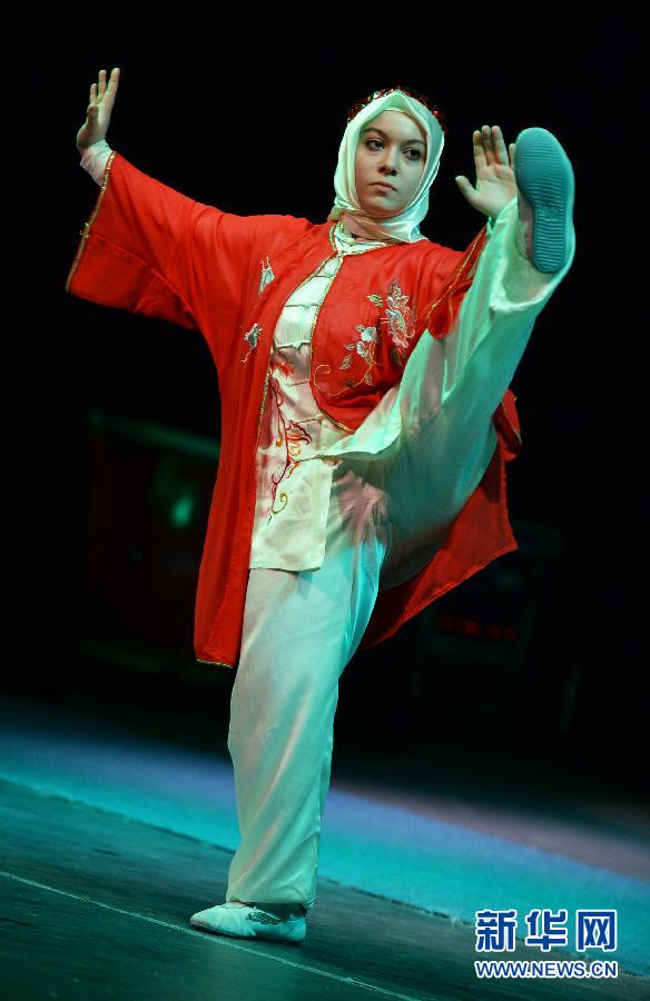2月13日,在土耳其伊斯坦布尔举行的欢乐春节综艺晚会上,一名土耳其演员表演武术。