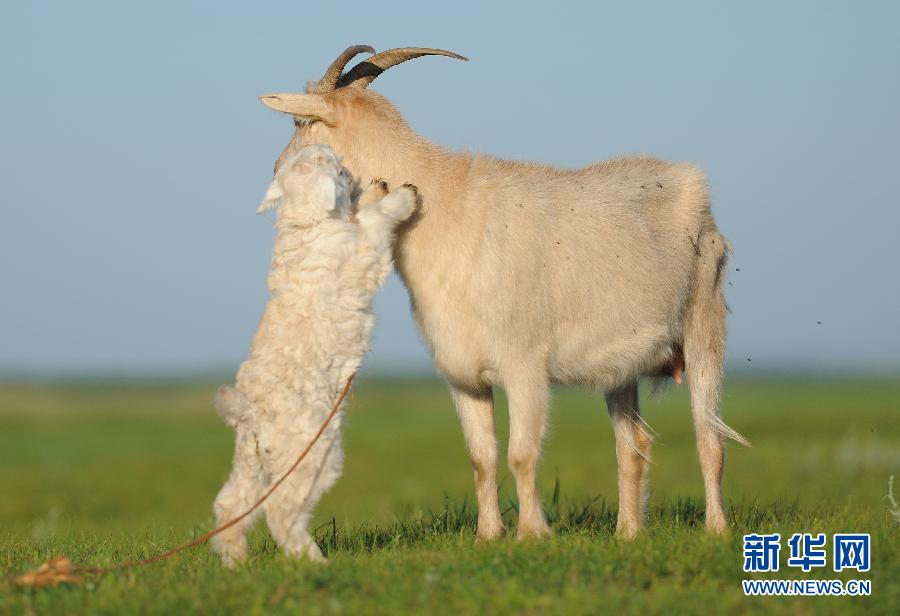 在内蒙古呼伦贝尔市新巴尔虎左旗乐都夏营地,一只羔羊拥抱它的妈妈(2012年8月6日摄)。羊年到,吉祥到。冬去春暖,福临康安。骏马奔腾辞旧岁,三“羊”开泰贺新春。春节钟声即将敲响,幸福美满的喜悦洋溢在人们脸上。祖国各地喜气“羊”“羊”,庆佳节,过大年。新华社发(青春 摄)