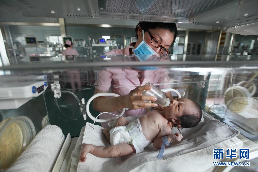 2月18日,江苏省连云港市赣榆区人民医院护士王楠在新生儿重症监护室为婴儿喂水。当日是农历除夕,全国各地环卫、医护、制造、运输、公安、电力等行业的工作人员仍然坚守在各自的工作岗位上,以特有的方式迎接新年的到来。新华社发(司伟 摄)