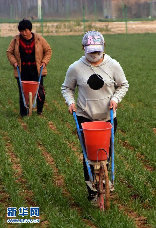 2月25日,在河南省商丘市睢阳区雷庄村,两名农民在给麦田追施化肥。新春伊始,河南省商丘市农民纷纷开始保墒追肥,夯实夏粮丰收基础。 新华社记者 王颂 摄