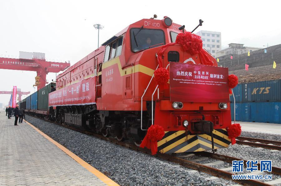当日,首班中亚班列缓缓驶出中哈(连云港)物流基地铁路专用线。12天后,它将到达目的地——哈萨克斯坦阿拉木图。班列开通初期,每周将有两列列车从中哈物流基地出发,经霍尔果斯换轨前往哈萨克斯坦阿拉木图。西行的每列将有约50个车厢,运载约100个标箱。此次班列的开通,将进一步畅通亚欧经济大动脉,为中哈合作打开一条运输时间短、经营成本低、市场竞争力强的贸易新通道,对推动丝绸之路经济带沿线国家在产业、经济、物流等方面的深入融合交流具有积极作用。新华社发(王健民 摄)