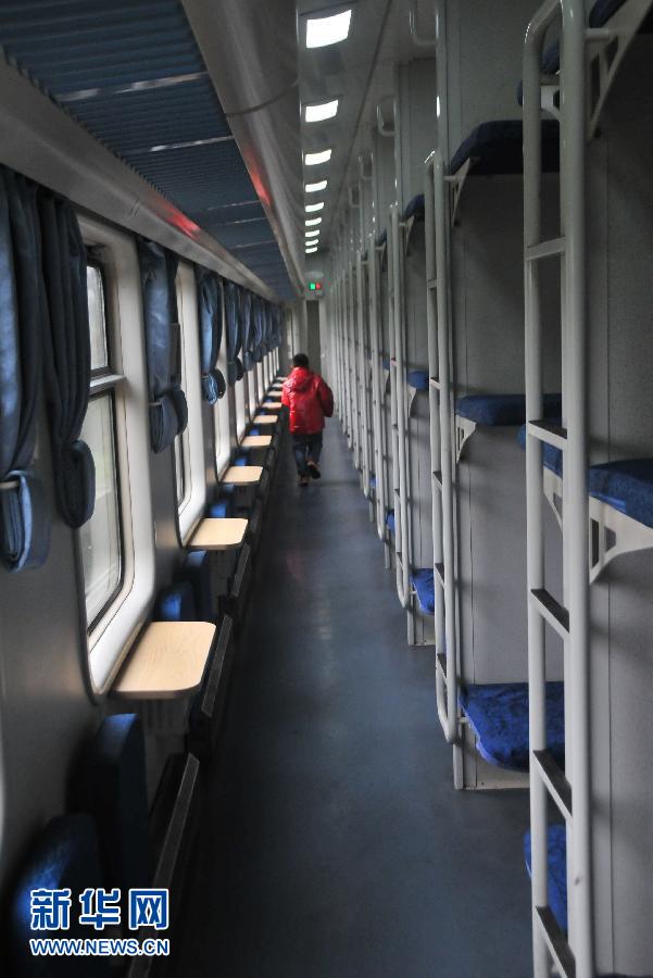 2月26日,在杭州开往贵阳的3599次列车上,一名小乘客在空荡荡的车厢中玩耍。由于中国春运多呈现客流单向性流动的特点,节后由沿海到西部、大中城市到小城市和农村的客流明显偏少,甚至出现整列客车仅有数十名旅客的现象。在2月26日杭州开往贵阳的3599次列车上,仅硬卧代硬座车厢及软卧车厢有数十名旅客,软座多节车厢整节空置。而这一列车从贵阳开往杭州则会超员60%左右。新华社记者黄勇摄