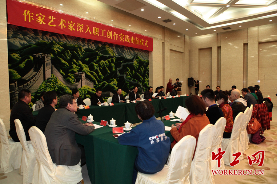 全国总工会27日下午在北京举行作家艺术家深入职工创作实践出征仪式。何建明、尹力、孟玲、梁秉堃、葛优、刘和刚、萨日娜、苏红等一批著名文艺工作者积极响应全总号召,表示拜职工为师、与职工交友,为职工创作更多更好的文艺作品,并为作家艺术家深入职工创作实践活动出征签名。全国总工会党组书记、副主席、书记处第一书记李玉赋出席仪式并讲话。  中工网记者 邱晔 摄