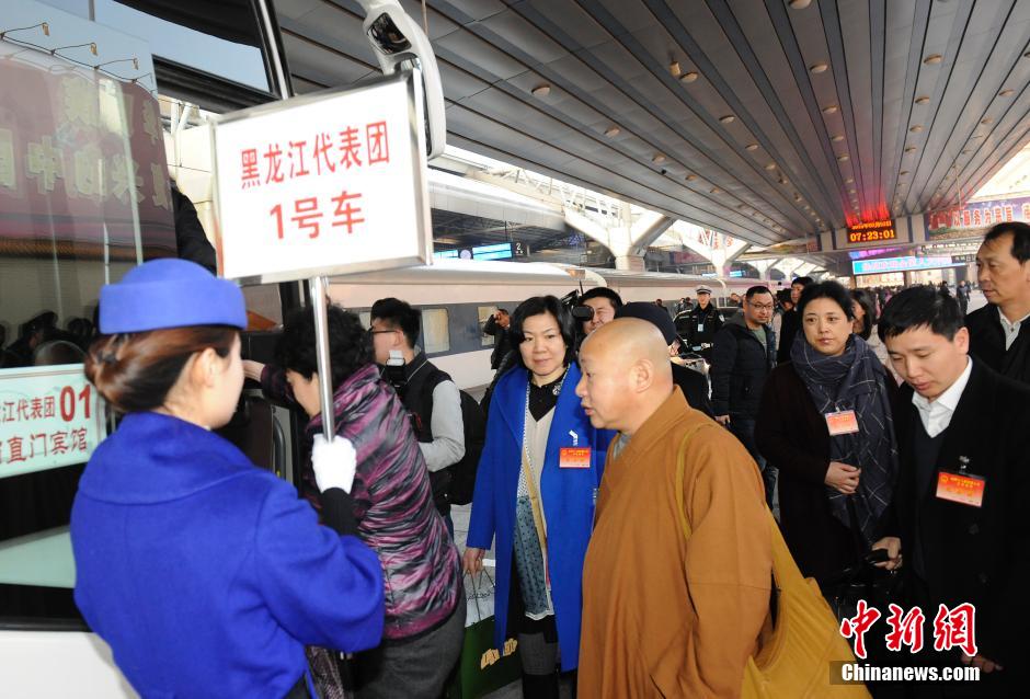 3月2日,参加十二届全国人大三次会议的黑龙江代表团乘火车抵达北京。 中新社发 侯宇 摄