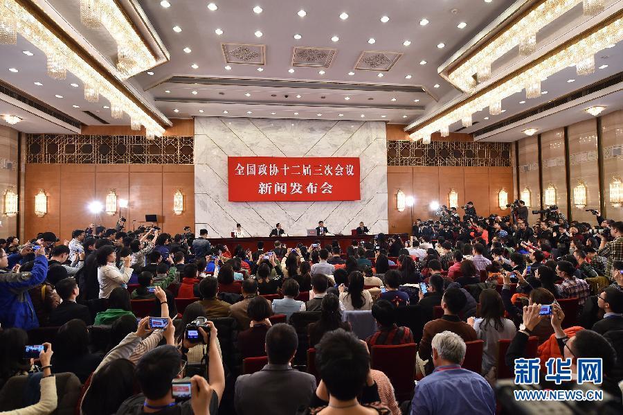 3月2日,全国政协十二届三次会议新闻发布会在北京人民大会堂举行,大会发言人吕新华介绍会议有关情况并回答中外记者提问。 新华社记者 李鑫摄 图片来源:新华网
