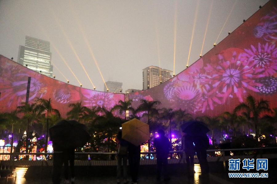 3月5日晚,人们在香港文化中心广场欣赏“闪耀维港”3D光雕汇演。2月21日至3月18日新春节庆期间,香港上演大型“闪耀维港”3D光雕汇演,每晚4场,每场约15分钟。“闪耀维港”3D光雕汇演是香港旅游发展局2014年底耗资2500万港元精心打造的多媒体全新节目。汇演以文化中心及钟楼外墙为“荧屏”,结合3D投影技术、音乐与灯光效果,为市民及游客带来全新的视听体验,成为香江上的一道亮丽风景。新华社记者 李鹏 摄