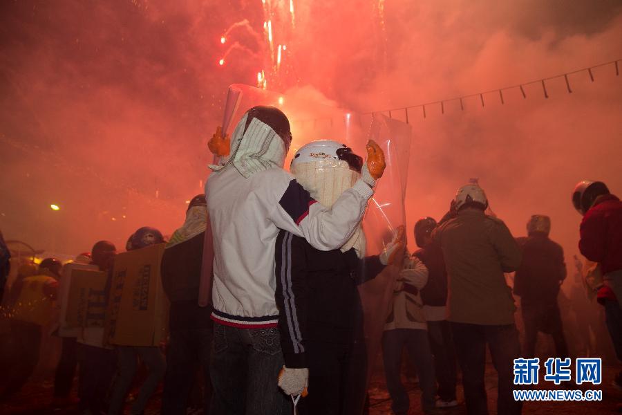 3月5日,游客们在台南市盐水区体验蜂炮的冲击。当日,南宁(宾阳)-台南(盐水)双炮文化交流活动在台南市盐水区举行。活动将广西宾阳炮龙节和台湾南部地区民间庆祝活动盐水蜂炮相结合,为两岸民众搭建了一个共庆元宵的平台。新华社记者 金立旺 摄