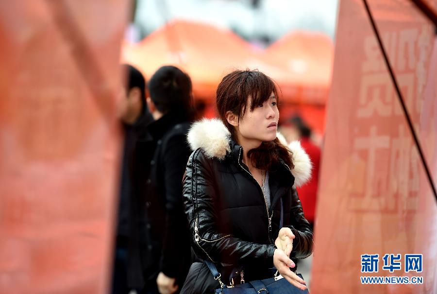 3月6日,女性求职者在招聘会上查看招聘信息。当日,安徽合肥市经开区劳动部门联合芙蓉社区举办“春风行动”女性专场招聘会,60多家用工企业为女性求职者提供了5000多个就业岗位。新华社记者 刘军喜 摄