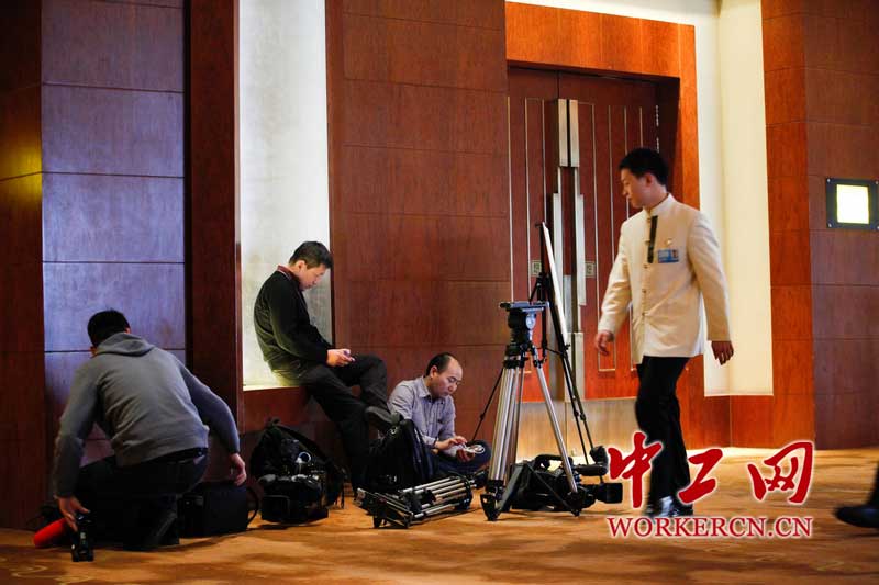 2015年3月3日,全国政协十二届三次会议在北京召开,据了解,今年采访报道全国“两会”的记者超过3100人。图为几名记者在妇联界别外等待会后采访。中工网记者韩靖摄
