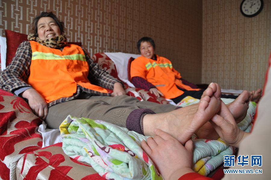 3月8日,环卫女工在享受免费按摩服务。当日是“三八”妇女节,河北省峰峰矿区城市管理局组织专业按摩人员为女性环卫工人提供免费按摩服务,让平时里辛勤劳动的环卫女工放松身心愉快度过自己的节日。新华社记者 牟宇 摄