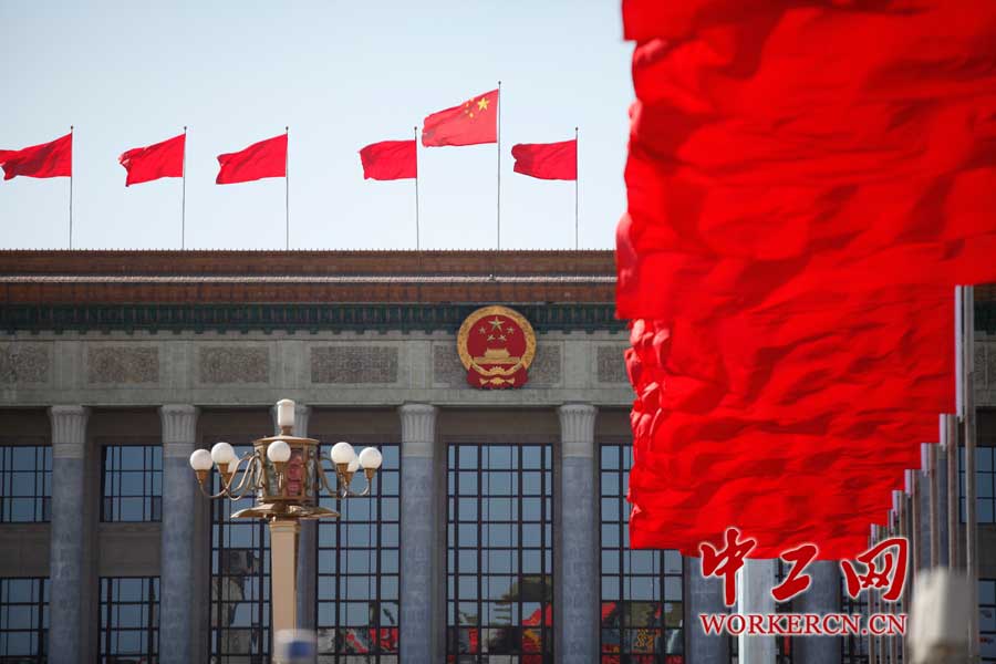 全国政协十二届三次会议第二次全体大会于3月9日下午3时在人民大会堂举行。天安门广场的五星红旗随风飘扬。  中工网记者 韩靖 摄