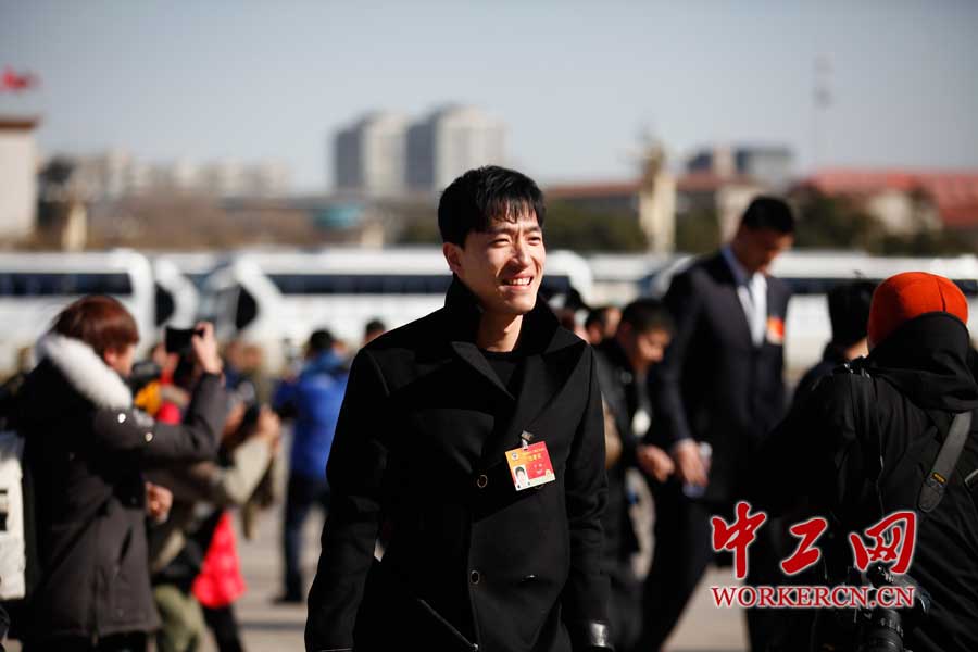 全国政协十二届三次会议第二次全体大会于3月9日下午3时在人民大会堂举行。刘翔委员一路面带微笑走进会场。中工网记者 韩靖 摄