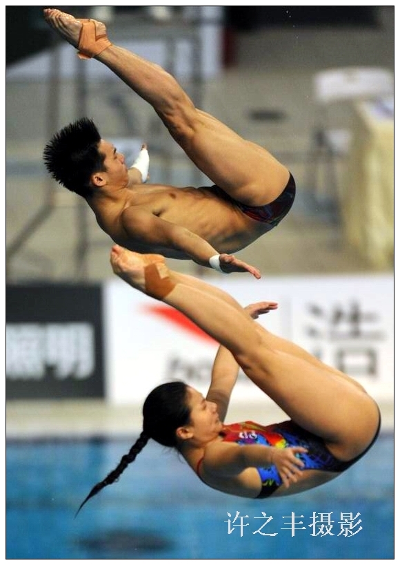 2015年3月14日,国际泳联世界跳水系列赛北京站在水立方进行。在首次亮相国际舞台的男女混合双人三米跳板决赛备受关注,最终中国组合何姿/陈艾森以330.00分力压加拿大、墨西哥组合勇夺金牌。工人日报-中工网记者许之丰摄影报道