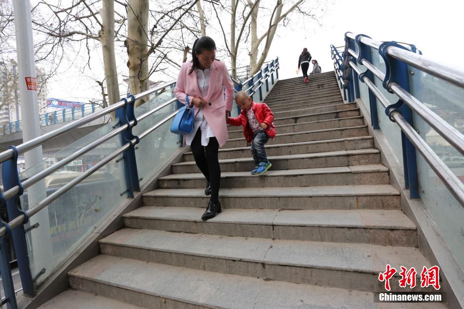 图为3月25日,行人从黄河路天桥上通过。杨正华 摄
