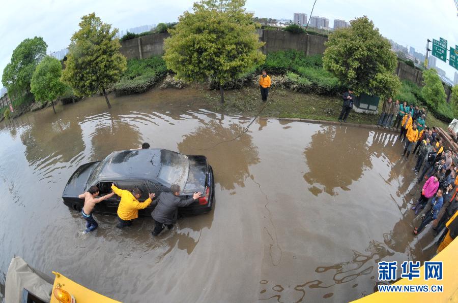 4月7日,长沙亚大路积水路段,人们将一辆被水淹的汽车推出来。当日,湖南长沙遭遇暴雨袭击,城区多处出现严重内涝,部分街道成“泽国”,一些机动车路过积水路段因熄火抛锚被水淹。湖南省气象台预计,未来一周长沙持续降温降雨,局地将出现雷暴、短时暴雨等对流性天气。新华社记者 龙弘涛 摄