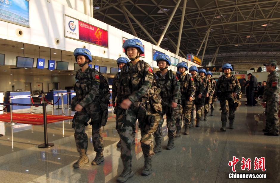 4月7日晚,济南遥墙机场,中国维和步兵营女兵班13名女兵与117名男兵一起搭乘维和专机出征。这是中国走出国门执行国际维和任务的第一支女子步兵班。13名女兵来自9个省3个部队,通过了268天严格而艰苦的训练严选而出。她们将在苏丹执行保护平民和联合国人员设施、人道主义救援行动,以及完成巡逻警戒、防卫护卫等任务。中新社发 仇成梁 摄