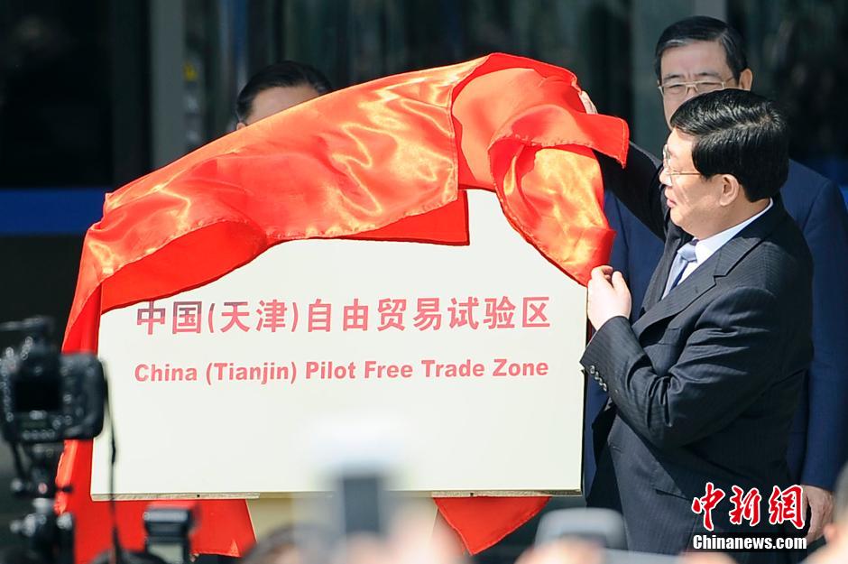 4月21日,中国(天津)自由贸易试验区举行挂牌仪式。中共天津市委代理书记、市长黄兴国出席仪式,并为“中国(天津)自由贸易试验区”揭牌。中新社发 佟郁 摄