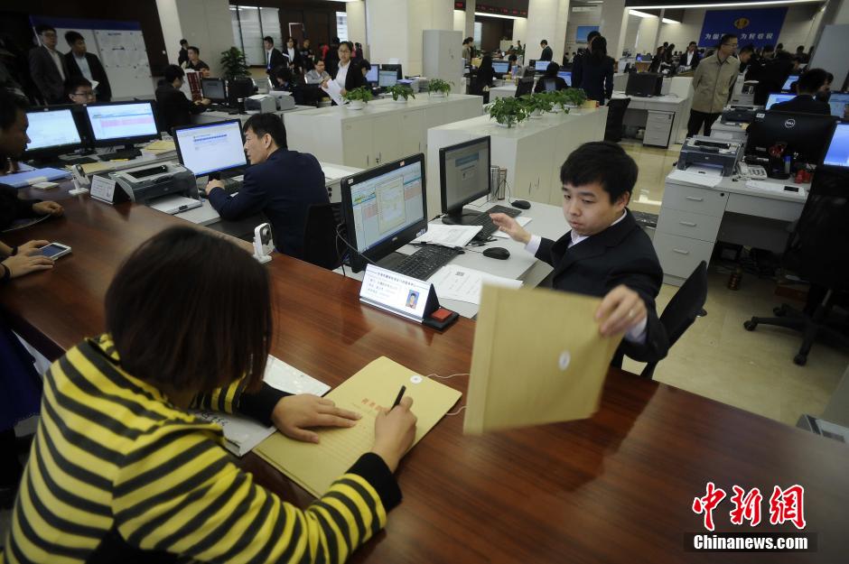 4月21日,在中国(天津)自由贸易试验区综合服务大厅,前来咨询和注册的企业代表络绎不绝。中新社发 佟郁 摄