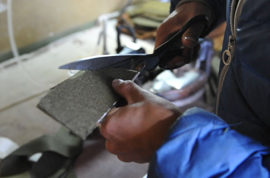 一块布料经过裁剪,变成了漂亮的藏式服装领口。土登说,他希望能创立自己的藏装品牌。