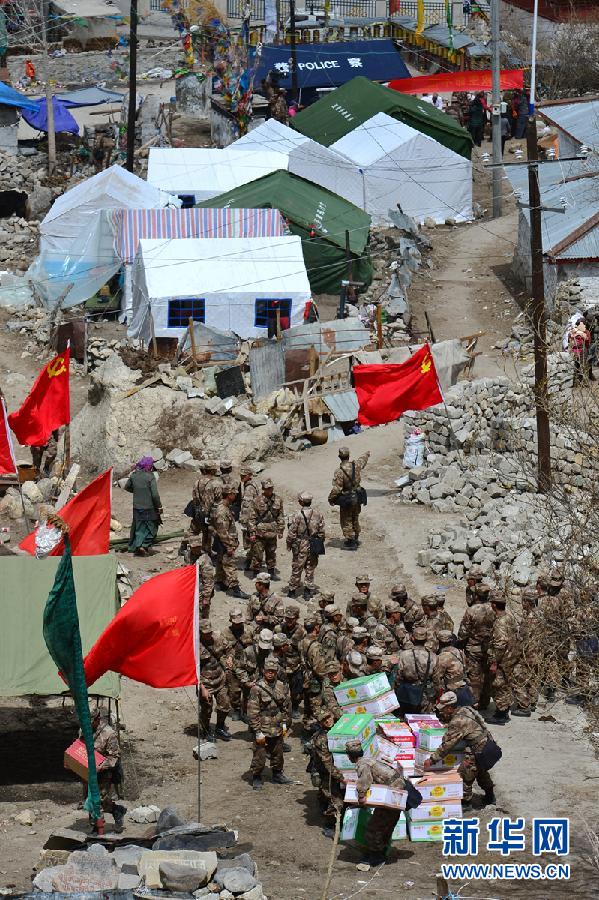 4月27日,西藏军区某团官兵为日喀则市聂拉木县充堆村受灾群众发放食品。当日,西藏军区抗震救灾部队全面深入开展搜救生命迹象、运送物资、巡诊医疗、搭建帐篷、转移物品等活动。 新华社发(张震 摄)