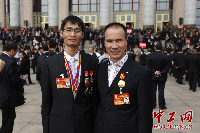 2015年4月28日,庆祝“五一”国际劳动节暨表彰全国劳动模范和先进工作者大会在京举行。肉孜麦麦提·巴克(右)在人民大会堂东门外广场偶遇自己的“偶像”吴吉林,兴奋之情溢于言表。