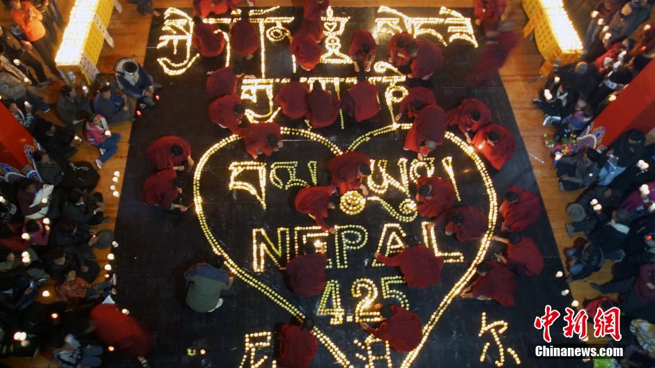 4月28日晚,青海省玉树市民众和僧人在结古寺为尼泊尔地震遇难者点灯祈福。五年前,玉树民众曾经历7.1级地震,对于失去亲人和家园的痛苦深有体会。从尼泊尔地震发生的第一个夜晚起,玉树民众都会自发前往格萨尔王广场、结古寺、新寨玛尼石堆点灯悼念逝者,为生者祈福。中新社发 切嘎 摄
