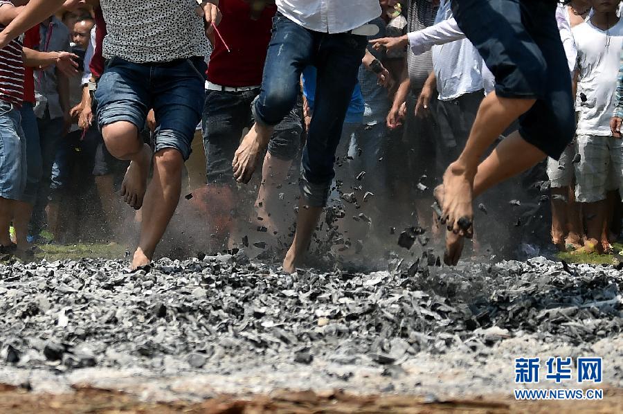 5月3日,当地民众在表演“下火海”。当日,海南省定安县文笔峰举行军坡节民俗活动,具有当地特色的传统习俗表演吸引了大批游客。 “闹军坡”是海南人特有的习俗,相传源于唐代,是为纪念我国岭南著名俚人首领冼夫人而举行的祭祀活动,距今已有上千年历史。 新华社记者郭程摄