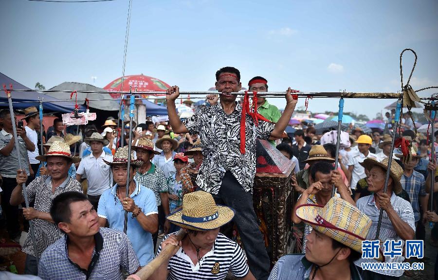 5月3日,当地民众在表演“穿杖”。当日,海南省定安县文笔峰举行军坡节民俗活动,具有当地特色的传统习俗表演吸引了大批游客。 “闹军坡”是海南人特有的习俗,相传源于唐代,是为纪念我国岭南著名俚人首领冼夫人而举行的祭祀活动,距今已有上千年历史。 新华社记者郭程摄