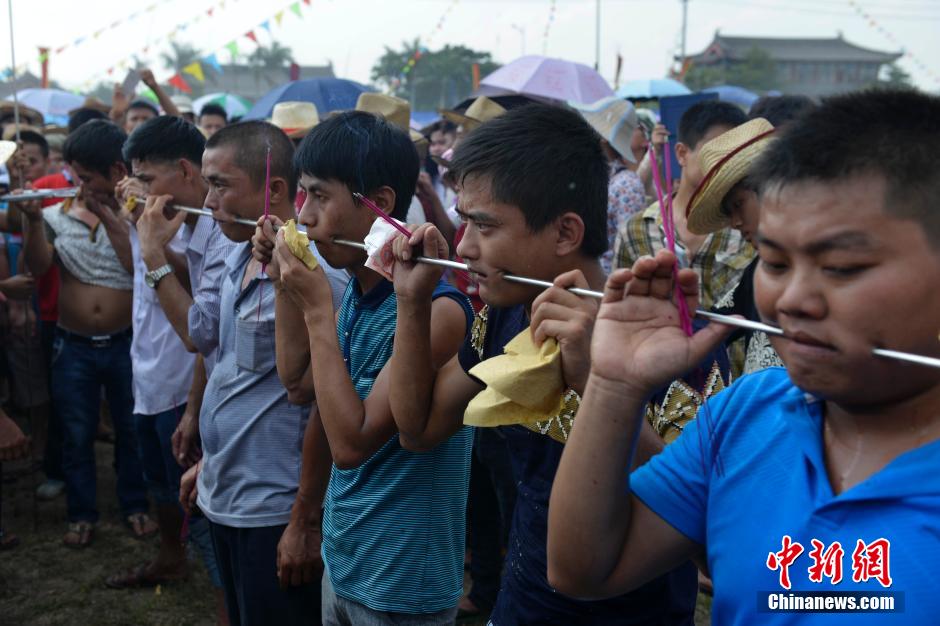 5月3日,中国海南军坡文化节在海南定安文笔峰举行,一场盛大的海南特有的风情习俗“闹军坡”在此上演。当天来自海南各地的60支公庙穿杖队伍表演穿杖仪式,海南当地6万民众参加了本次活动。据了解,“军坡节”据传已有1300多年历史。该节日在定安尤为隆重。中新社发 骆云飞 摄