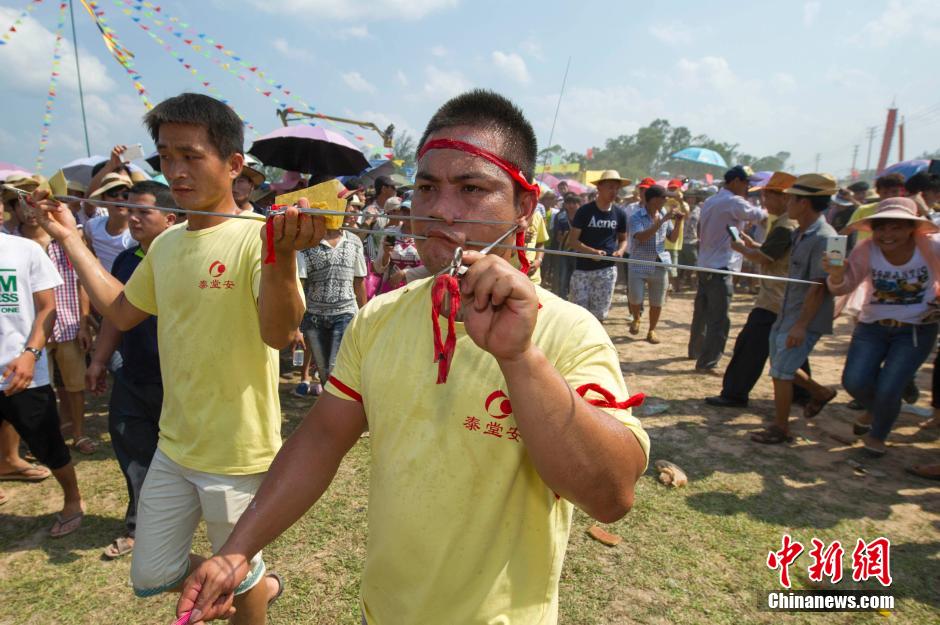 5月3日,来自海南各地的60支公庙穿杖队伍表演穿杖仪式。中新社发 骆云飞 摄