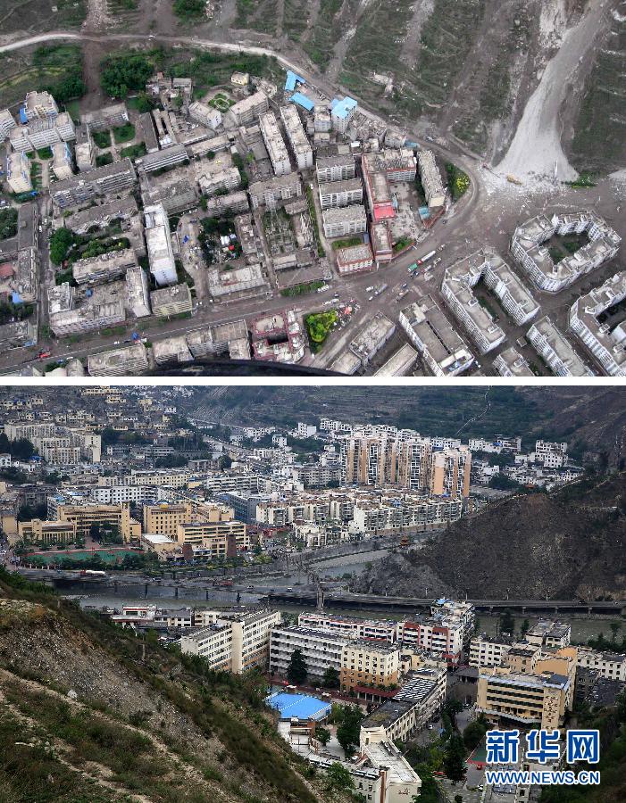 上图:2008年5月14日航拍的地震后的四川省汶川县县城(新华社记者徐壮志摄);下图:2015年5月6日从空中俯拍的四川省汶川县县城(罗国杨摄)。 5月12日是汶川地震七周年纪念日,经过7年的重建和恢复,地震中损毁严重的汶川获得新生。 新华社发