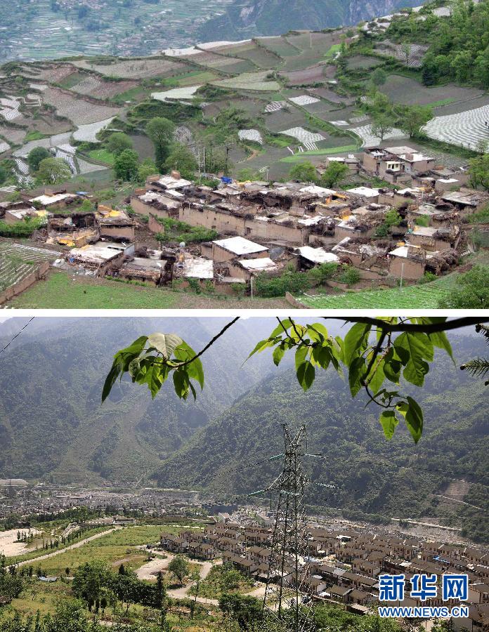 上图:2008年5月14日航拍的地震后的四川省汶川县山间农舍(新华社记者徐壮志摄);下图:2015年5月6日拍摄的四川省汶川县乡村新貌(罗国杨摄)。 5月12日是汶川地震七周年纪念日,经过7年的重建和恢复,地震中损毁严重的汶川获得新生。