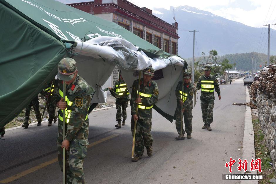 5月17日,日喀则市吉隆镇帮兴村帐篷安置区由于受最近几天余震影响,部分安置点帐篷土质疏松、积水严重,给灾区民众生活带来不便。西藏边防总队机动支队二大队由中队长才旦晋美带队紧急赶往1.5公里处的帮兴村展开救助行动。到达帮兴村后,官兵迅速展开排查,排查中发现帮兴村安置区地面凹凸不平、积水严重,严重影响民众生活。为防止受次生灾害发生,官兵们向村长了解情况后迅速投入战斗,经过2个多小时的连续奋战后,受灾群众帐篷及物资全部转移完毕。张钰 摄
