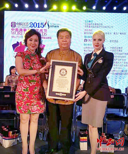 中国旗袍会汪泉理事长(中)领取吉尼斯世界纪录证书。