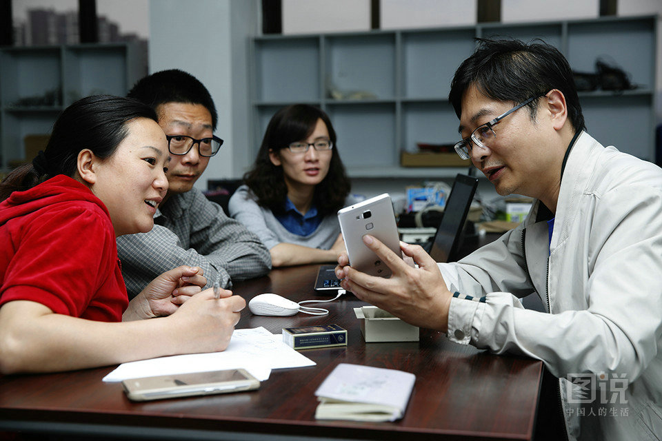 与团队伙伴们一起解决网络终端的技术难题,对徐晨来说充满着挑战的乐趣。图为徐晨与公司技术员工探讨产品技能开发与产品技术革新。