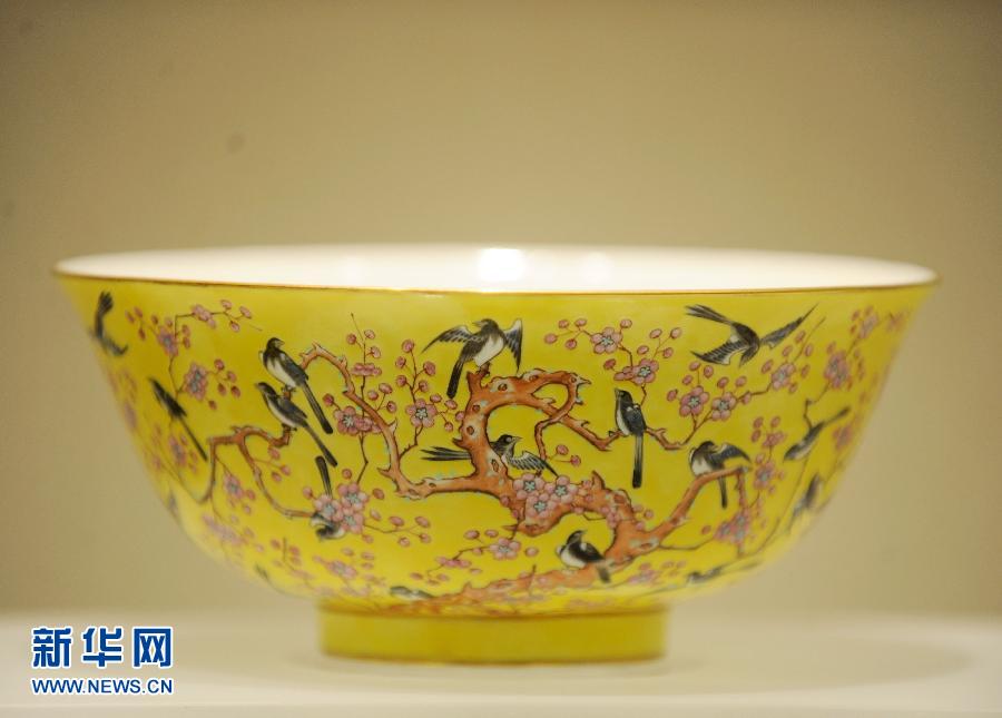 这是5月22日拍摄的清同治黄地粉彩梅鹊纹餐具。近日,十余件清代同治皇帝大婚餐具亮相辽宁省博物馆举行的“明清瓷器展”。该套瓷器由碗、盘碟、粉盒等构成,为烘托新婚喜庆气氛,餐具的色彩浓艳,纹饰均采用“双喜”或“喜鹊登梅”等吉祥图案,尽显皇家气派。据辽宁省博物馆相关负责人介绍,同治皇帝大婚,朝廷特命江西巡抚景福在景德镇御窑厂督烧套装餐具。这批瓷器烧造历时4年,在大婚当年即清同治七年(1868年)烧制完成,成品共计120桶、7290件。新华社发(张文魁 摄)