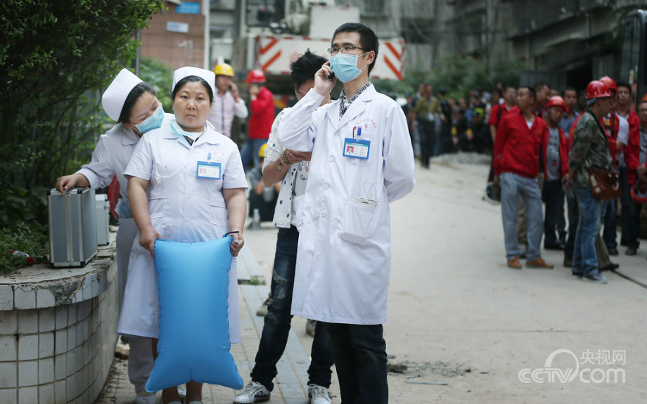 在专家组的指导下,贵阳市消防、医疗、电力、燃气等100余人的救援队伍,在现场开展救援工作。医护人员现场待命。