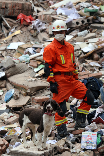 消防特勤搜救犬正在废墟中搜索埋压群众。