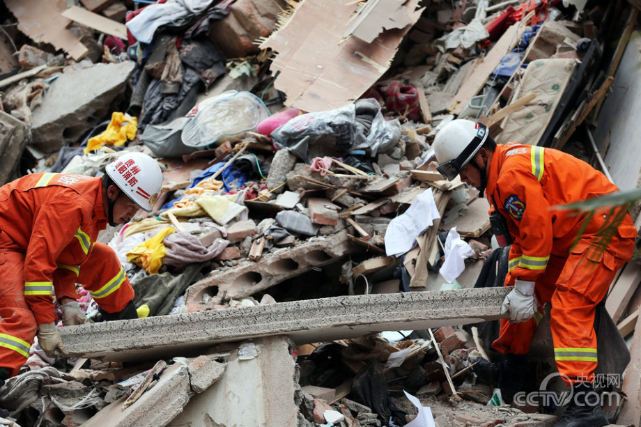 5月20日,救援队员在清理垮塌的楼板。截至5月20日14点30分,事故发生3小时后,已排查35户,其中93人确认安全,有21人还在联系之中。
