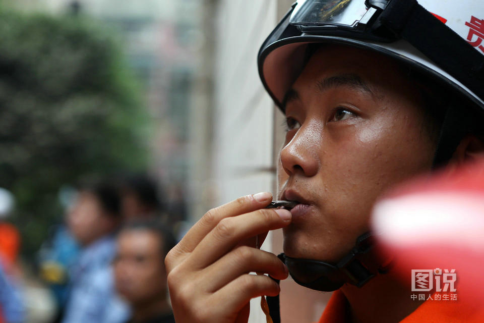一位消防员含着警戒哨,盯着塌方的山体,警戒二次灾害发生。