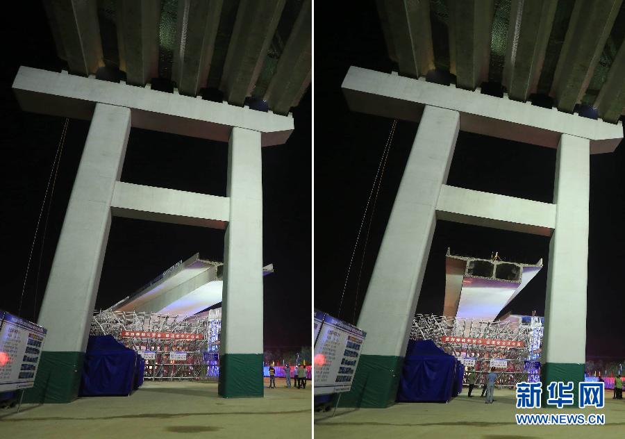 5月27日,由中国铁建大桥工程局承建的京秦高速公路跨京哈铁路转体桥成功转体。该桥位于天津市蓟县,为减少对京哈铁路的影响,确保京哈铁路运营安全,该工程采用双幅同步转体法施工:先在避开京哈铁路的角度进行桥梁施工,之后再将桥梁旋转49度,跨越京哈铁路。京秦高速西起北京六环,东至秦皇岛,预计2015年10月通车,建成后将有力促进京津冀地区经济和交通一体化进程向纵深发展。新华社记者邢广利摄