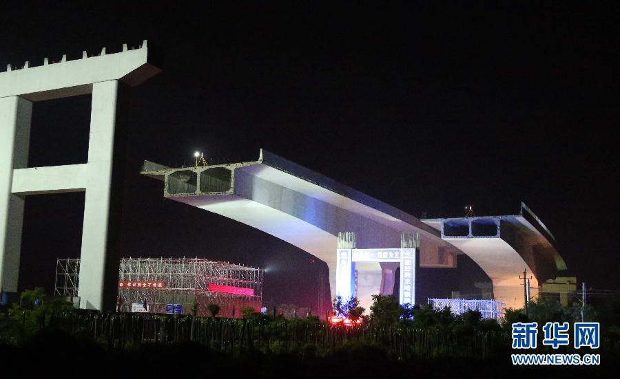 5月27日,由中国铁建大桥工程局承建的京秦高速公路跨京哈铁路转体桥成功转体。该桥位于天津市蓟县,为减少对京哈铁路的影响,确保京哈铁路运营安全,该工程采用双幅同步转体法施工:先在避开京哈铁路的角度进行桥梁施工,之后再将桥梁旋转49度,跨越京哈铁路。京秦高速西起北京六环,东至秦皇岛,预计2015年10月通车,建成后将有力促进京津冀地区经济和交通一体化进程向纵深发展。 新华社发(刘文摄)