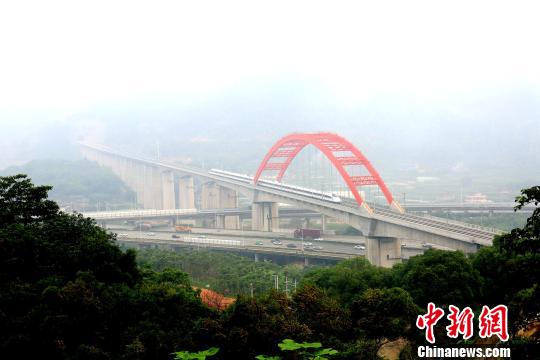 图为福州至合肥南G1802次车通过福州市区的“彩虹桥”。 雍万俊 摄
